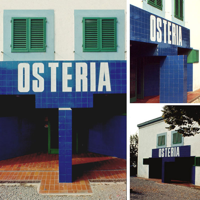 Rebuscando por la web de Cristiano Toraldo di Francia (uno de los miembros de Superstudio) he encontrado este proyecto de 1968 que coquetea con la idea de Supergráfica y que supone la renovación de una pequeña vivienda convertida en Osteria para los trabajadores de la fábrica de muebles Poltronova (para la que diseñaron varias líneas de mobiliario)... transformando toda la puerta del conjunto en una hipergráfica con azulejos añil...